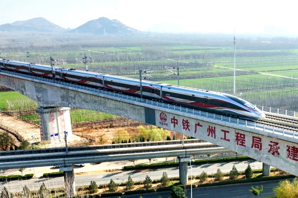 列车驶过济郑高铁跨刘长山路地铁R1线转体连续梁桥